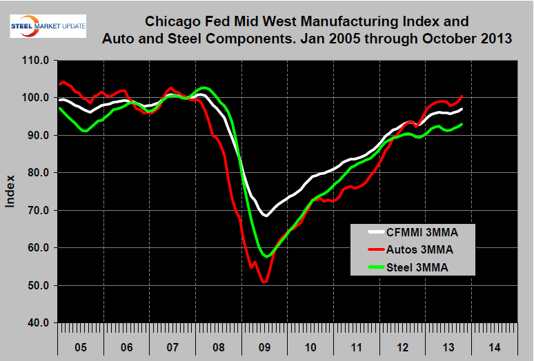 SMU Comment: this Chicago Fed commentary is based on monthly changes. At SMU we always track the 3MMA to smooth out the short term data but in this instance both tell the same story. Manufacturing in the Mid West has been strengthening since July. Autos are now at pre-recessionary levels but steel lags by ten points. This confirms other data which shows that the steel market has not kept up with its major demand sectors.