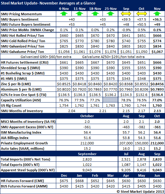 After two months of sideways movement, November saw our SMU Pricing Momentum Indicator shift to reflect higher steel prices as the trend over the next 30 days. Our proprietary SMU Steel Buyers Sentiment Index remained within optimistic range of the index at +36.5. Sentiment was down one point from the prior month and three points compared to September.