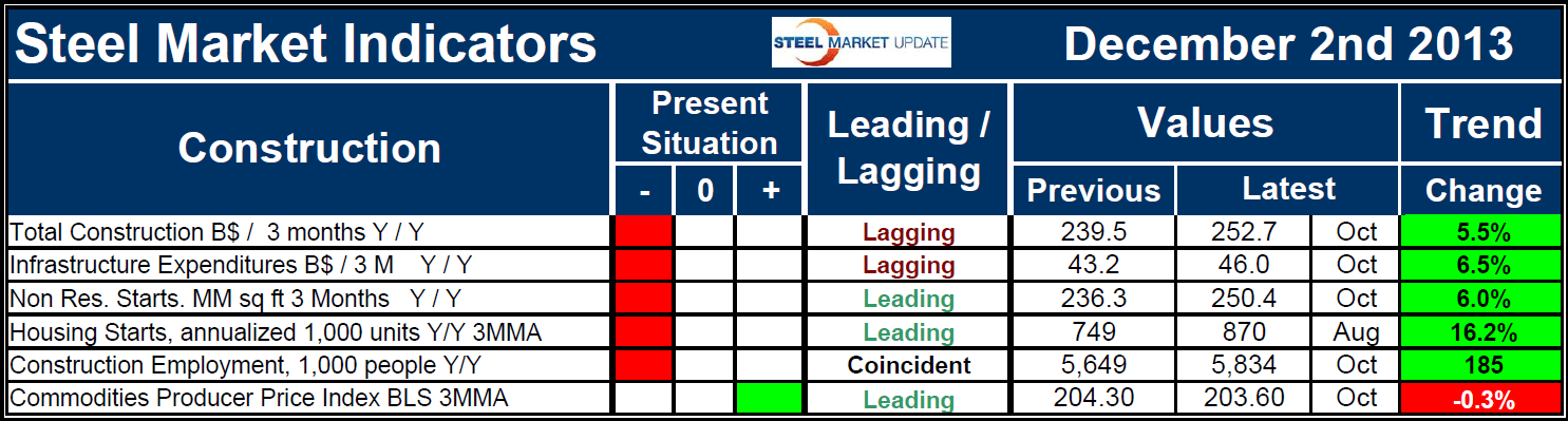 Each month Steel market Update publishes a table of 38 indicators that we believe captures the essence of the steel market and its drivers. Six of these indicators deal with construction which we believe consumes about 22 percent of all steel products in the US at present. Table 1 shows the construction section of the steel consumption indicators analysis as of December 2nd. The indicators are classified as leading, coincident or lagging as indicated.