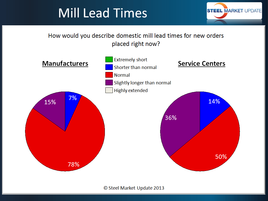 Second, we ask those taking our survey to review and advise the average lead times they are seeing by product. Based on the latest survey results, lead times extended on hot rolled coil now being referenced as averaging 4.56 weeks. Cold rolled lead times also moved out and are now reported as averaging 6.55 weeks. Galvanized lead times came back in slightly and are now reported to be 6.30 weeks. Galvalume lead times moved out a tad from 6.22 weeks to 6.36 weeks. Compared to last year at this time lead times are much longer on all products with the possible exception of Galvalume.