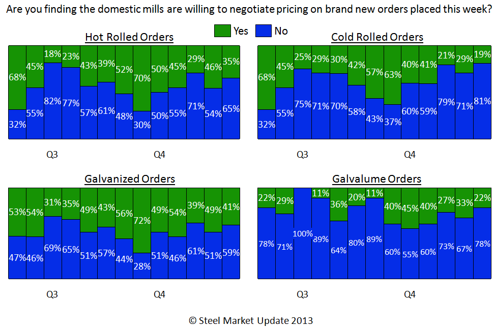 Based on our survey results from this week we found that the domestic mills are limiting the amount of negotiations on each of the flat rolled steel products followed by Steel Market Update. Thirty five percent of our respondents reported the domestic mills are willing to negotiate hot rolled pricing. This is down from 46 percent reported during the middle of November. Cold Rolled dropped from 29 percent to 19 percent which is the lowest level of the year.