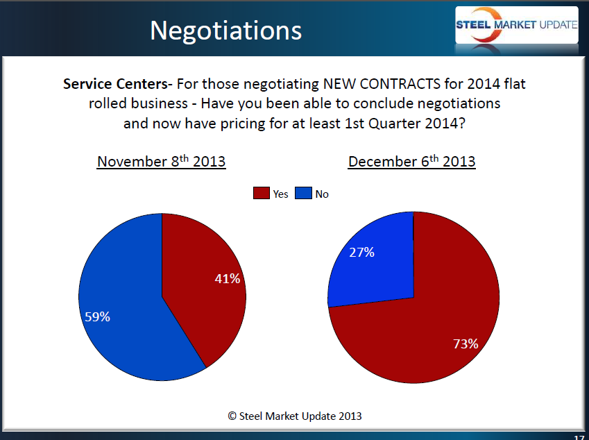 When we polled our respondents in our flat rolled steel market analysis at the beginning of November we found both segments of the industry struggling to get their deals done for 2014. As you can see from the graphics shown as part of this report, 59 percent of the service centers and 66 percent of the manufacturers had not come to conclusion on their contracts in early November. By the time we got to the first week of December our analysis found a total reversal with 73 percent of distributors and 66 percent of manufacturing companies reporting their 2014 contracts as being done.