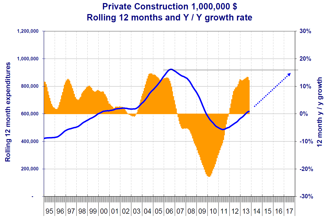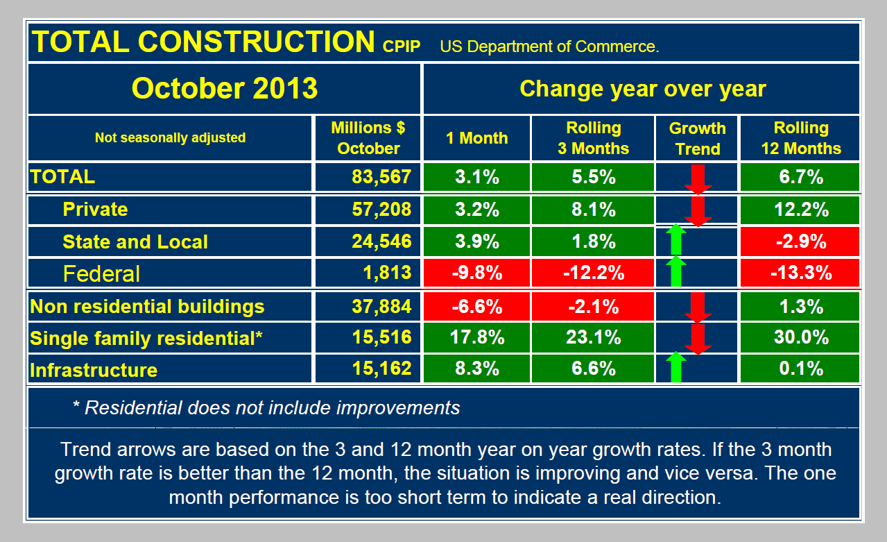 In October, total construction expenditures were $83.567 billion of which 68.5 percent was privately funded, 29.4 percent was state and local and 2.2 percent was federally financed. Of the total expenditures, 82.04 percent, (October only) falls into three major categories. Non residential buildings accounted for $37.844 billion, down 2.1 percent from 2012 on a three month moving average basis (3MMA). Single family residential was $15.516 billion; up 23.1 percent 3MMA year / year and infrastructure was $15.162 billion, up by 6.6 percent 3MMA year over year (Table 1). Total construction in October was up by 3.1 percent compared to October last year, (y / y), on a rolling three month basis construction grew 5.5 percent y / y and on a rolling 12 month basis growth was 6.7 percent y / y. The three month growth rate was less than the 12 month growth rate meaning that momentum was negative and growth slowed slightly in the last three months.