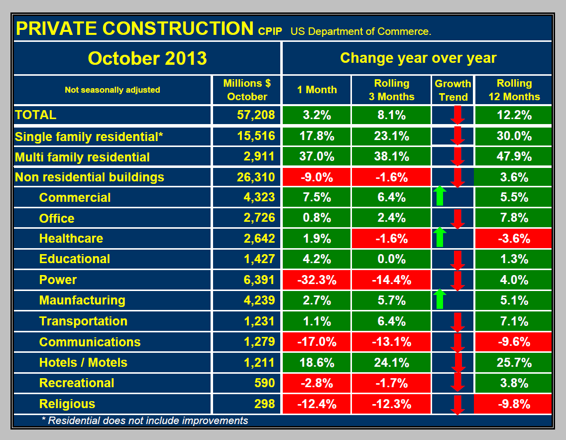 In October on a 3MMA basis year over year private construction grew by 8.1 percent. Single family residential grew by 23.1 percent, multi family residential by 38.1 percent and non residential contracted by 1.6 percent. This was the first contraction in non residential in 27 months and may be revised upwards at a later date because even though the starts data published by McGraw Hill Dodge has slowed, starts have come nowhere near negative growth. The residential results are in line with the housing starts data of the first five months of 2013. Since then starts of both multi and single family have declined. This change will show up in the CPIP data in the next few months. Table 2 shows private construction by sector. Ten of the thirteen sub sectors have negative momentum. Commercial, healthcare and manufacturing buildings are all strengthening.