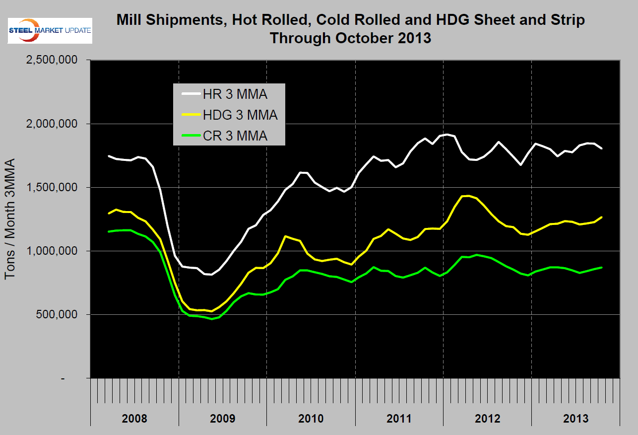 Cold rolled had the worst year to date performance, being down by 5.2 percent but, in the most recent three months, picked up 5.1 percent compared to the period May through July. Electro galvanized had the best performance in all three time frame comparisons. Figure 1 shows that following the post recession recovery, hot rolled has been little changed for two years. Shipments of hot dipped galvanized sheet and strip declined strongly in Q2 through Q4 last year but have made up a third of that loss this year. All coated products combined, including HDG, EG and other which is mostly galvalume totaled 4,383,5491 tons in 3 months through October, up by 5.5 percent from the May through July time frame. Cold rolled has been improving slightly this year after declining in the 2nd half of 2012. These figures are shipments to domestic locations plus exports based on the AISI AIS10> and Commerce Department trade reports.