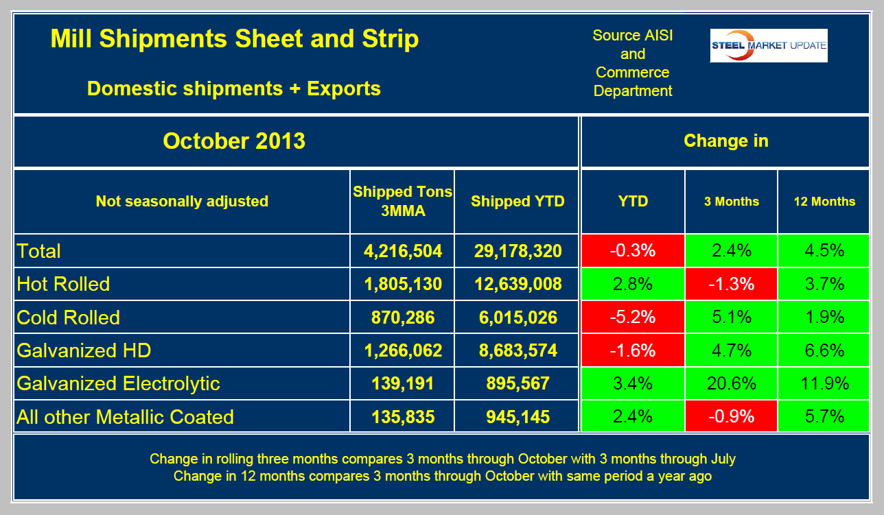 Shipments of sheet and strip products in the first 10 months of 2013 were 29,178,320 tons, a decrease of 0.3 percent from the same period last year. Shipments in the three months August through October averaged 4,216,504 tons / month, an increase of 2.4 percent from the previous 3 months May through July and an increase of 4.5 percent from August through October last year (Table 1).