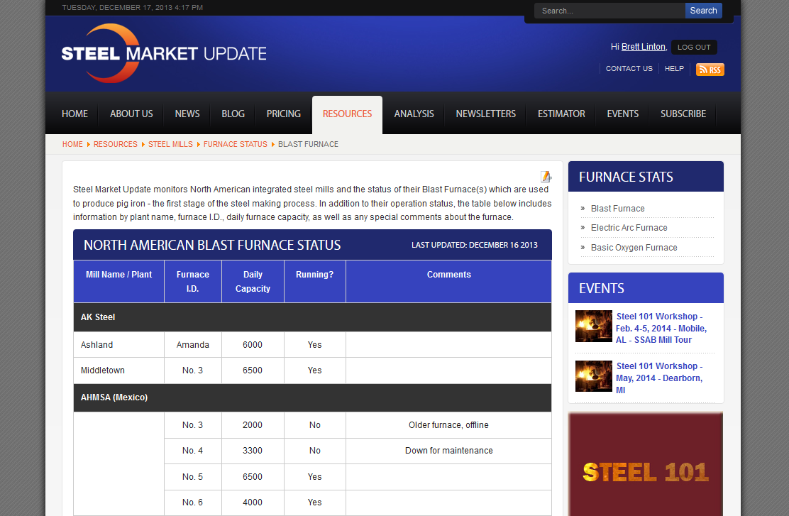 We want to take a moment to remind our Executive Members (as well as our trial members) that we have a section under the Resources tab for steel mills. Once there you can navigate to the Furnace Status sub-menu tab and then over to the Blast Furnace tab where you can access the most up-to-date status as to what blast furnaces are running in North America. We attempt to update this information on a weekly basis or when we find furnaces which may have been pulled offline suddenly (such as the USS Great Lakes furnaces on Sunday).
