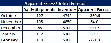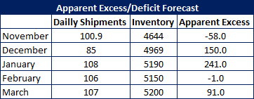 Our forecast for November (which we recently shared during our talk at HARDI) was for service center inventories to drop from -361,000 tons to an Apparent Excess of +64,000. We did accurately forecast a dramatic drop in the Deficit but missed on the ending inventory point.