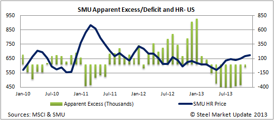 As you can see by the graph below benchmark hot rolled prices continue to rise. With the reduction in Apparent Inventory Deficit, the question is will prices flatten out from here or make a move higher or lower and to what degree. We are forecasting an Apparent Excess in inventories at the end of December (see tables below).