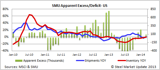 Using our model shipments, shipments were up year-over-year while inventories were down year-over-year. Our SMU Apparent Deficit model dropped to -58,000 tons vs. -361,000 last month.