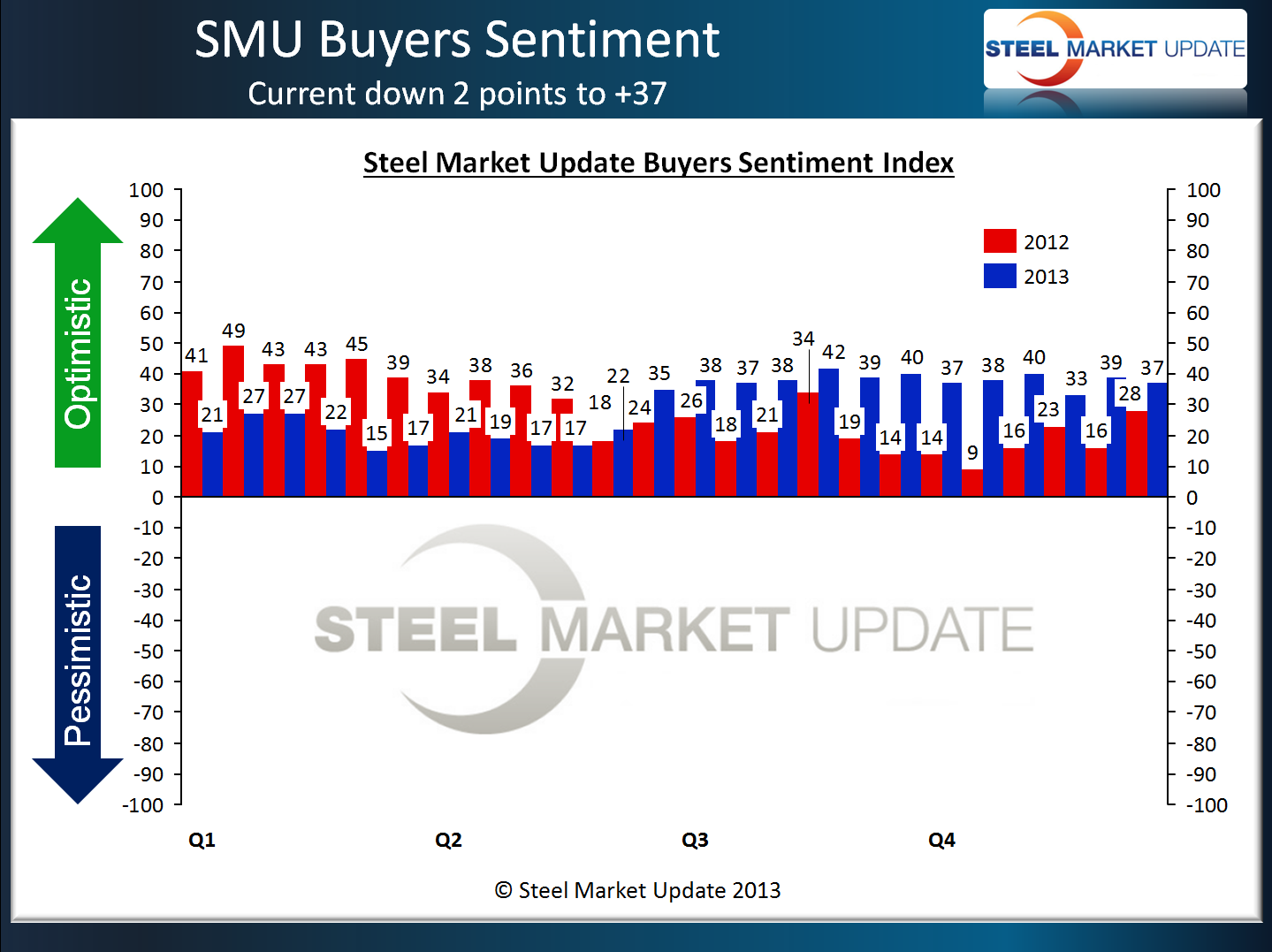 The Steel Market Update (SMU) Steel Buyers Sentiment Index was reported this week to be +37 which is 2 points lower than our last reading made during the first week of December. Nonetheless, SMU Steel Buyers Sentiment is well within the optimistic range of our index where it has been for 24 consecutive months. Sentiment has been range bound in the upper 30’s since the middle of June 2013.