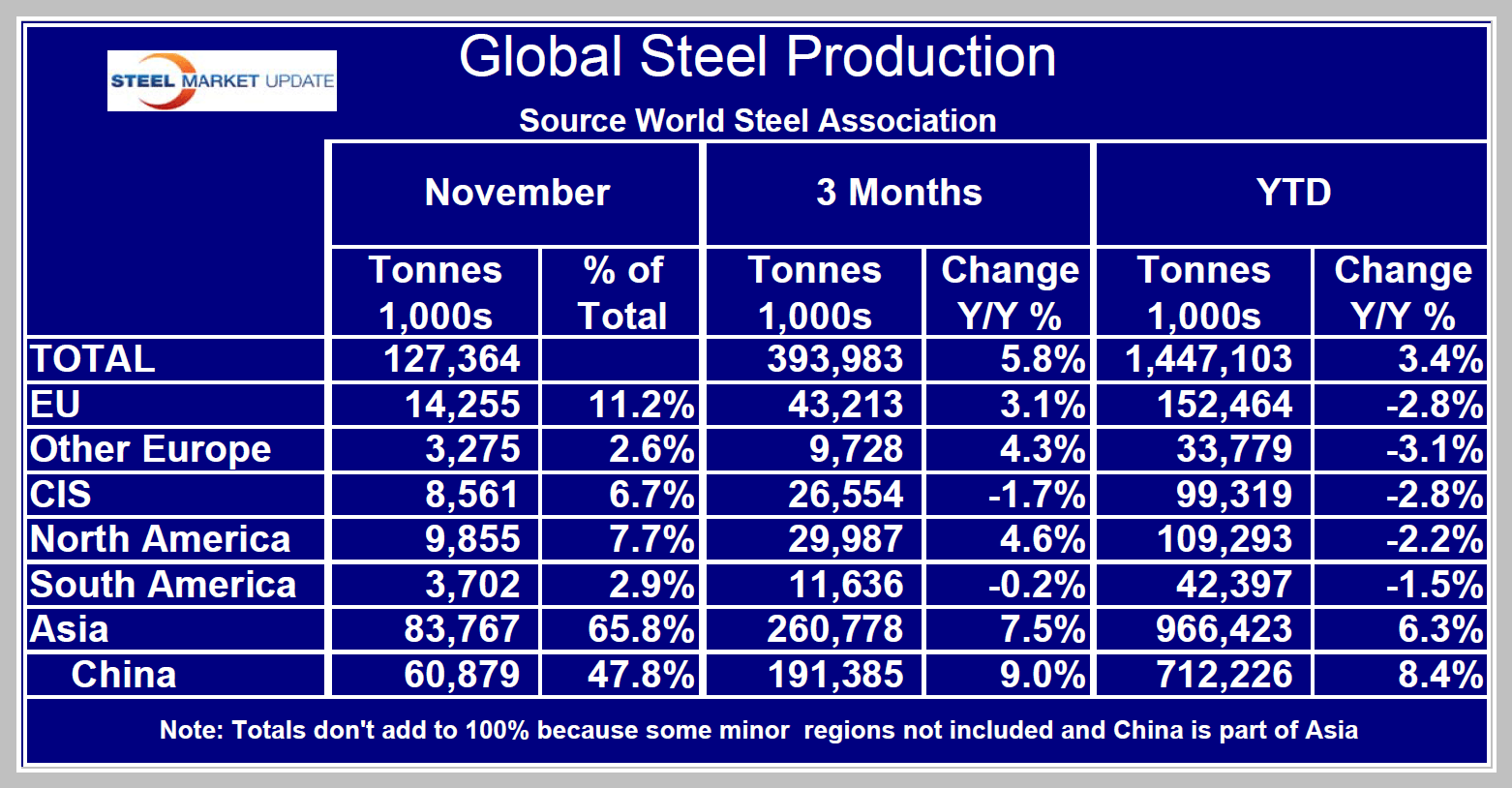 SMU Comment: Reports of a global economic slowdown are not being reflected in the steel production statistics. We keep waiting for China’s growth of steel production to slow as has been predicted elsewhere. Hopefully the November result is a pre-cursor of that change. (Source: World Steel Association)