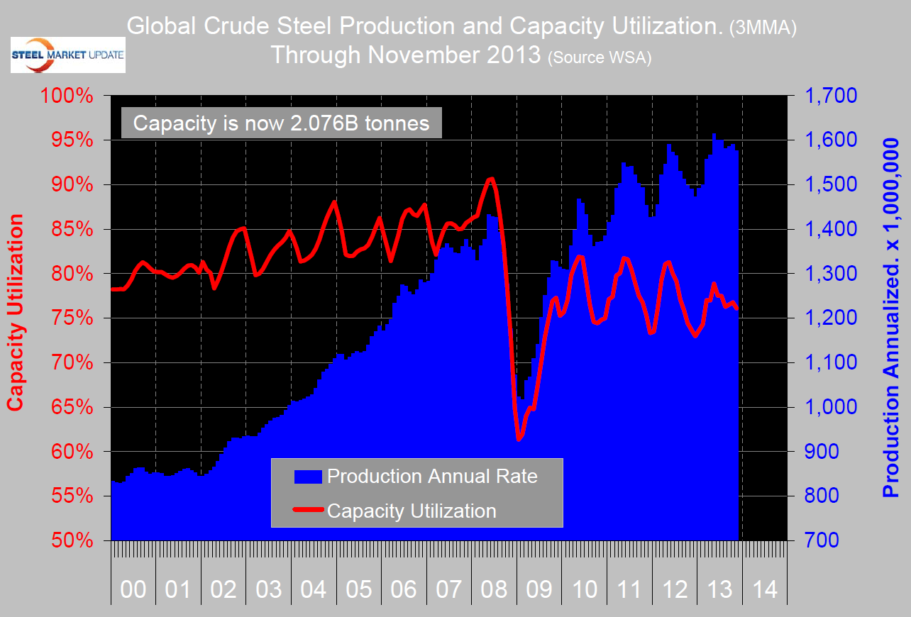 Capacity utilization was 74.0 percent. The annualized three month moving average production was 1.576 billion tonnes through November (Figure 1). Capacity is now 2.076 billion tonnes. Global production this year has deviated from the pattern of the last three years by holding onto the gains made in the first half year. In three months through November global production grew by 5.8 percent year over year and year to date production was up by 3.4 percent compared to the first 11 months of 2012. The fact that the last three months growth rate was stronger than the YTD result means that momentum is increasing. This was true of all regions, even for the CIS and South America where the decline lessened. China grew 9.0 percent in 3 months through November and by 6.4 percent year to date, both year over year (Table 1). In the month of November, North America and China produced 7.7 percent and 47.8 percent of the global total respectively. November was China’s lowest production month since January.