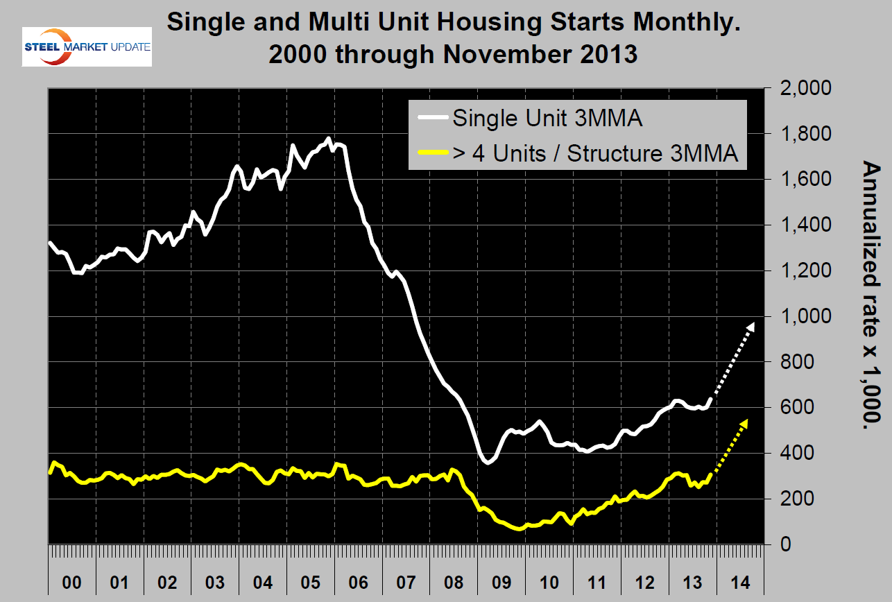 Finally the first data on housing starts since August! Total starts in November shot up to 1,091,000, (annualized), the highest since February 2008. Both single and multi family starts were the strongest since H1 2008.