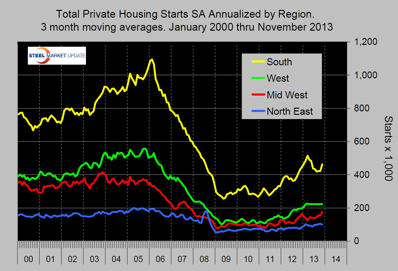 The three month moving average of starts was also very encouraging. At the present rate of increase, single family could reach the one million rate by the end of next year (Figure 1). Multi family have already fully recovered from the recession so the recent result was surprising for this sector. It may be that we are witnessing a long term shift in the mix of housing away from single towards apartments. Prior to the recession the ratio of single to multifamily units was six to one. Today the ratio is only two to one. The recent surge in starts was driven primarily by the South region and to a lesser extent by the Mid West. The North East and the West have been more or less flat for the last ten months (Figure 2).