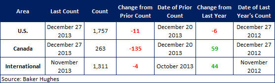 According to Baker Hughes data from December 27, 2013, the U.S rig count for this week is 1,757 rigs exploring for or developing oil or natural gas. This count is a decrease of 11 rigs when compared to last week, with oil rigs down 13 to 1,382 rigs, gas rigs up 2 to 374 rigs, and miscellaneous rigs unchanged at 1 rig. Compared to last year the 1,757 count is a decrease of 6 rigs, with oil rigs up by 55, gas rigs down by 57, and miscellaneous rigs down by 4.