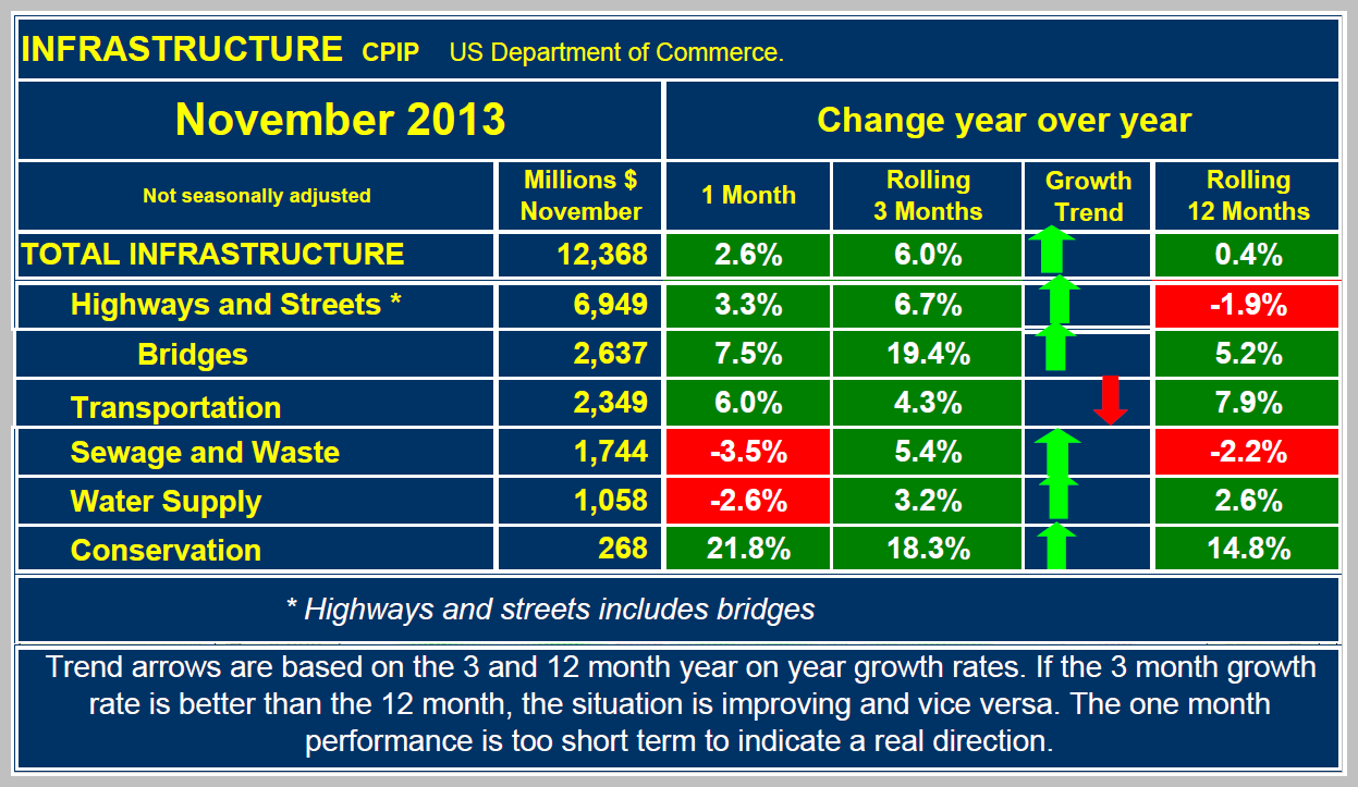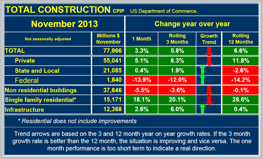 In November, total construction expenditures were $77,966 billion down by 8 percent from October but this was purely a seasonal effect. There is no point comparing construction statistics one month or one quarter after another as the results are so seasonal that such a comparison is meaningless. By financing in November, 70.6 percent was privately funded, 27.0 percent was state and local and 2.4 percent was federally financed. Of the total expenditures, 83.6 percent falls into three major categories. Non-residential buildings accounted for $37.646 billion, down 5.5 percent from November 2012, single family residential was $15.171 billion, up 18.1 percent year over year and infrastructure was $12.368 billion up 2.6 percent year over year. Table 1 shows expenditures for November with year-over-year comparisons monthly and on 3 and 12 month rolling averages (3MMA and 12MMA). Total construction in November on a 3MMA basis was up by 5.8 percent year-over-year and up by 6.8 percent on a 12MMA basis. The three month growth rate was less than the 12 month growth rate meaning that momentum was negative and growth slowed slightly in the last three months.