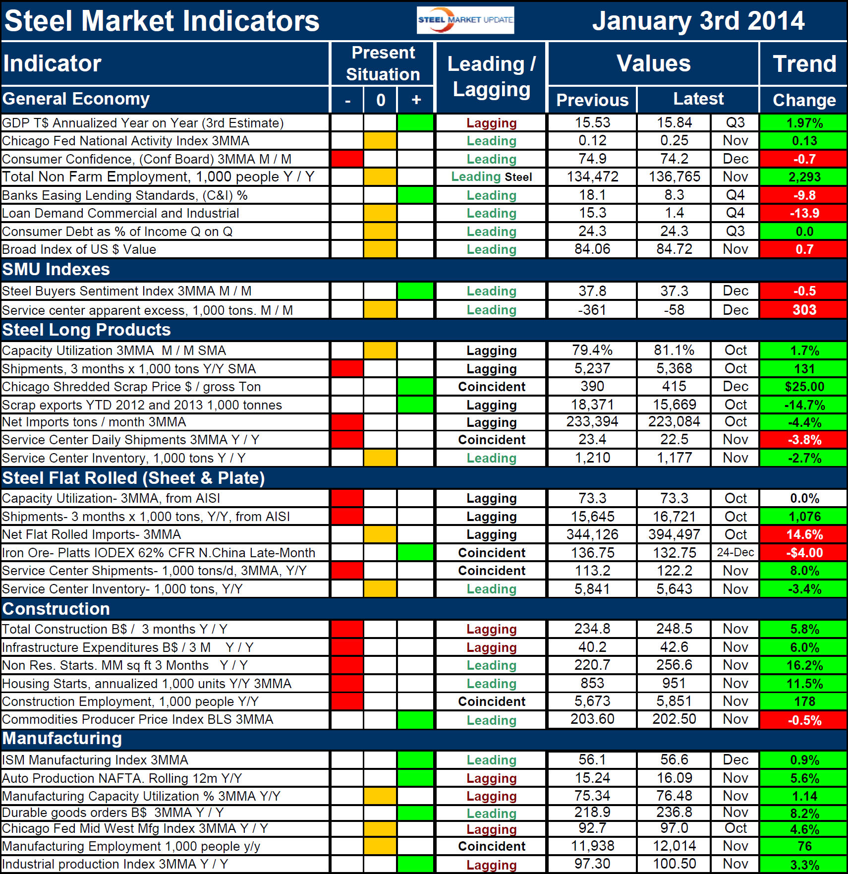 The quantitative analysis of the value of each indicator over time is shown in the “Trend” column. At present, trends are moving in the right direction. Twenty five of thirty six indicators are improving with one indicator unchanged. This is a decrease of two in the deteriorating category. Trends in the general economy were unchanged with four positives and four negatives. We expect this ratio to move towards positive in 2014 based on recent economic data. Both the SMU indexes had a negative trend. The buyer’s sentiment is still optimistic though it declined slightly from the November value. The service center apparent excess decreased markedly from negative 361,000 tons to negative 58,000 tons driven by a year-over-year inventory increase and shipment decrease. The only negative trend in the steel long products sector was a decline in daily service center shipments on a three month moving average basis year-over-year. Capacity utilization of the flat rolled sector was unchanged at 73.3 percent Net imports increased and the price of iron ore decreased. Shipments increased from both mills and service centers on a year-over-year basis. All the construction indicators except the producer price index of commodities are improving as are all of the manufacturing indicators.