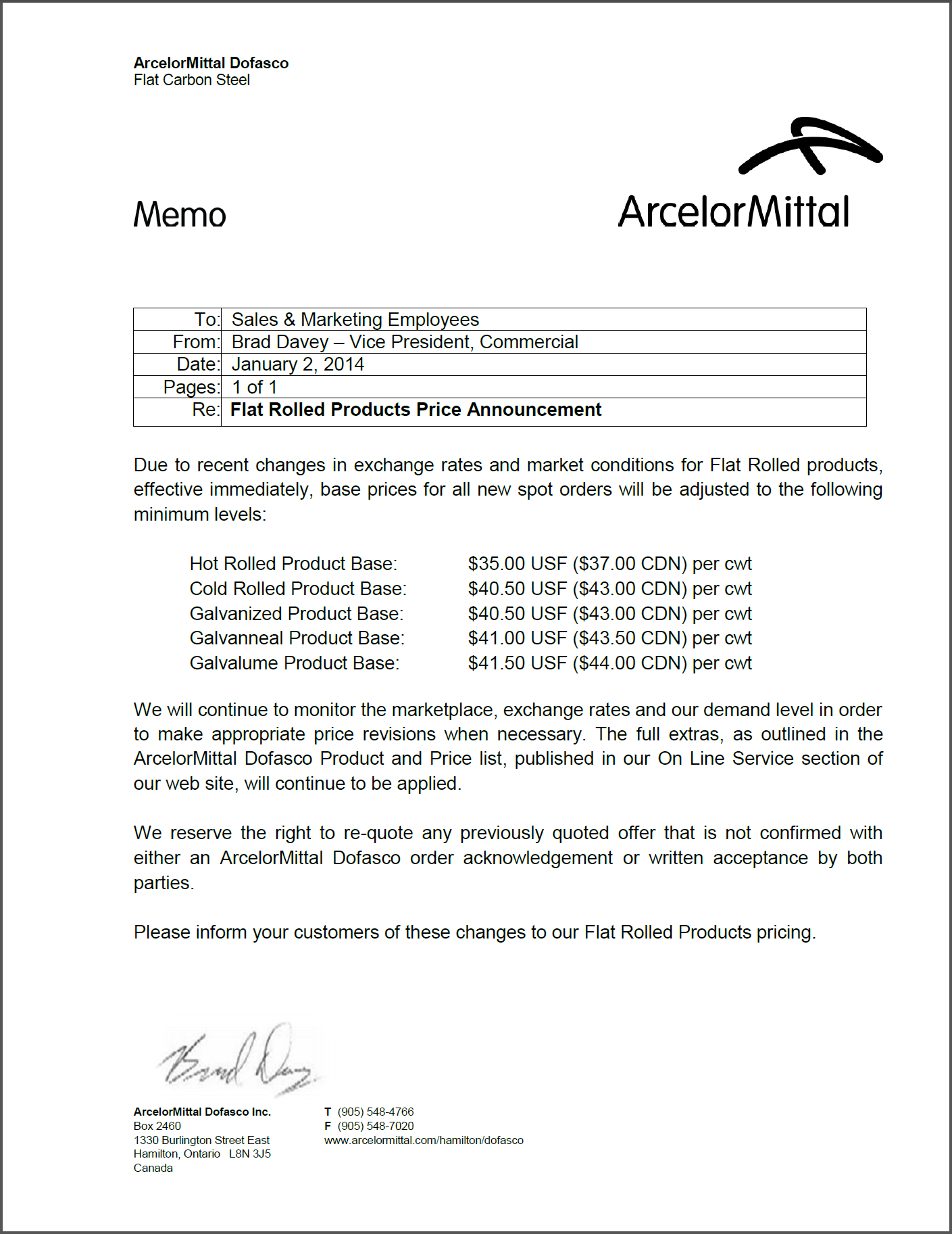 On Wednesday, January 2, 2014, ArcelorMittal Dofasco out of Hamilton, Ontario, Canada advised their customers through the use of an internal memo that their flat rolled steel prices would change. The company noted the changes were being made, “Due to recent changes in the exchange rates and market conditions for Flat Rolled products…” The company went on to state that the changes being requested were to be in effect immediately.