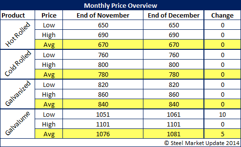 Hot rolled and cold rolled prices went essentially nowhere from the of the month of November until the end of December. Galvanized average pricing rose by $15 per ton from the beginning of the month until the end of December. Galvalume prices moved higher by $10 per ton.