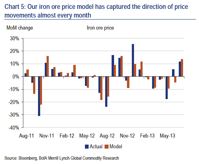 According to the BoA analyst their model has consistently captured turning points in iron ore prices over the past few years (see below):