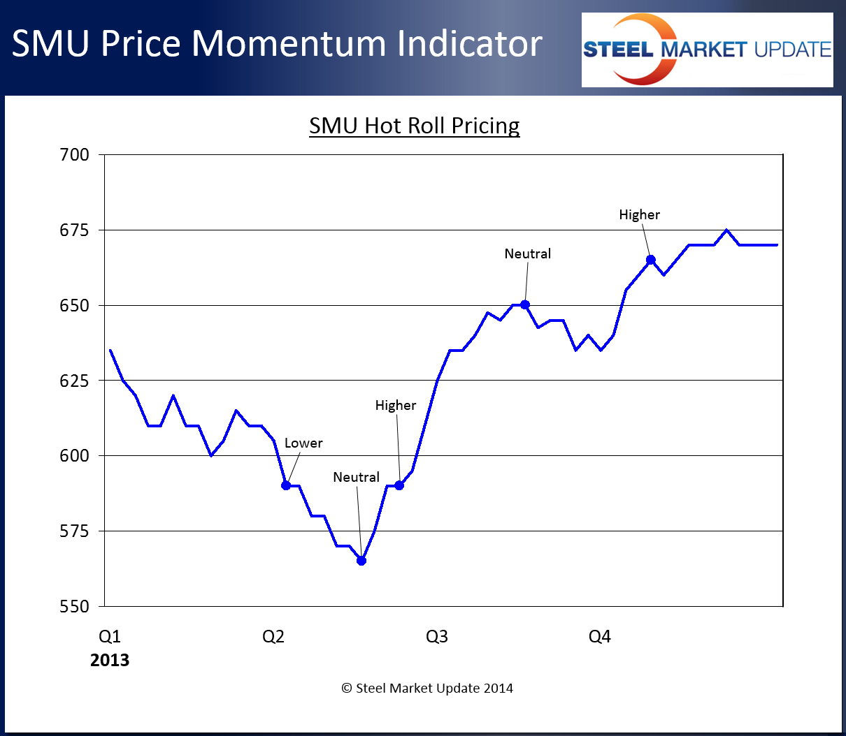 The following displays the movements Steel Market Update had in our Price Momentum Indicator during calendar year 2013. As you can see, there were not a lot of changes throughout the year. One had one strong move lower (at a time of year when we normally don’t see lower pricing – 1st Quarter) and then it was pretty much uphill from there with one sideways move in late 3rd Quarter.