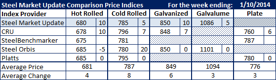 Flat rolled steel prices began to rise this past week according to the steel indices releasing data for the week. Benchmark hot rolled now averages $681 per ton with the range being $675 to $685 per ton (although the $675 is from SteelBenchmarker who did not report new numbers last week). Cold rolled is approaching $800 per ton and both galvanized and Galvalume also saw modest increases.