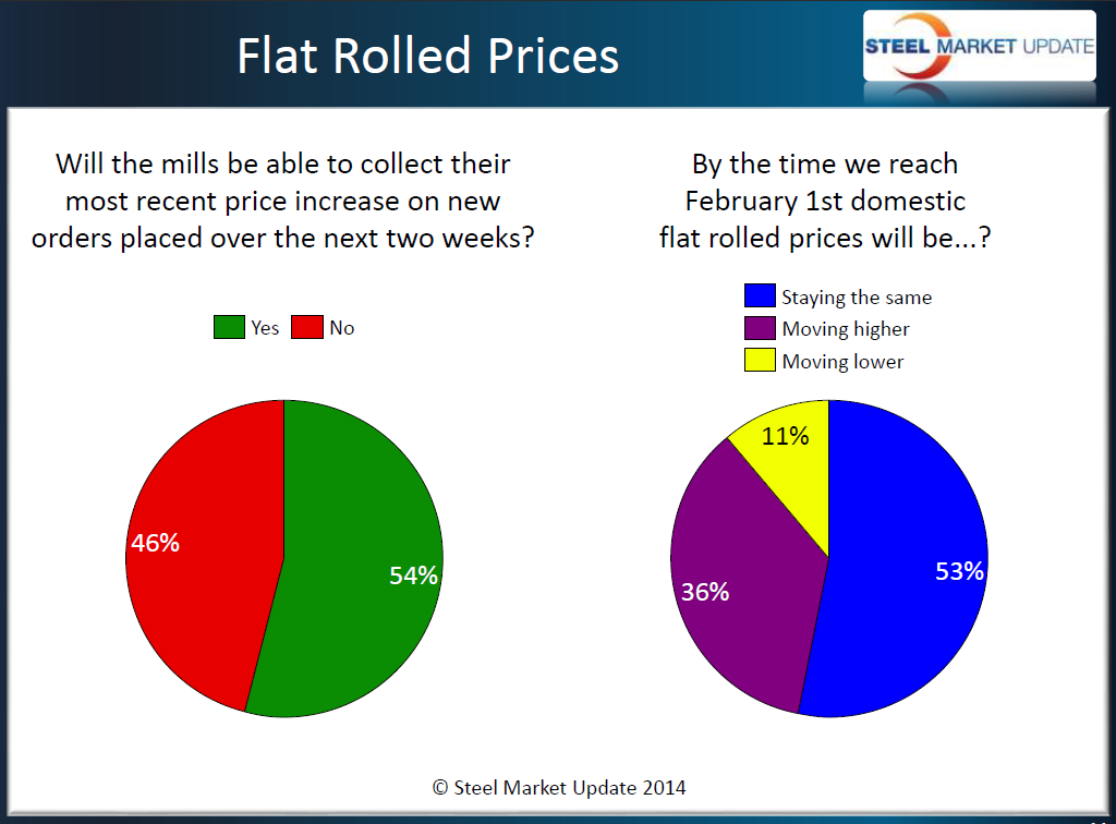 The majority of flat rolled steel buyers and sellers taking our most recent Steel Market Update (SMU) survey are reporting that they expect that domestic steel mills will be able to collect their most recent price increase within the first two full weeks of January.
