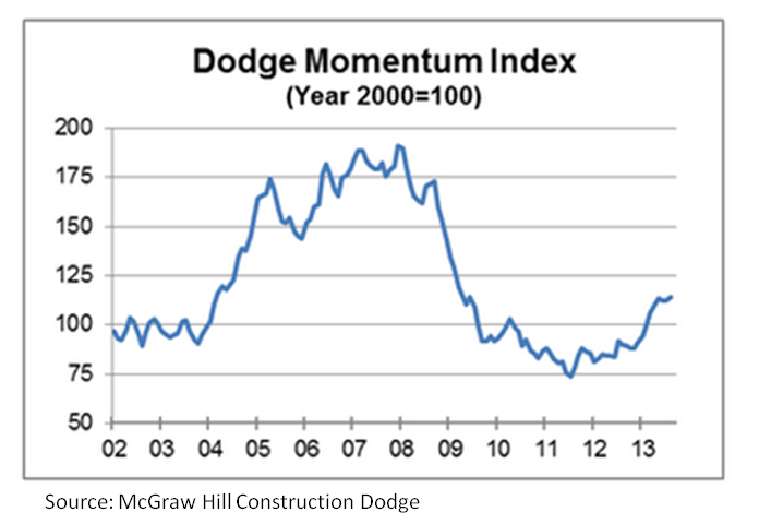 If you look at the yearly Momentum Index chart there is been an upward trend throughout 2013 after an erratic year in 2012 that roughly parallels the Architectural Billings Index, a report that looks at inquiries for design services for nonresidential building projects. Although construction for residential housing has showed strong growth in 2013, nonresidential construction continues to drag.