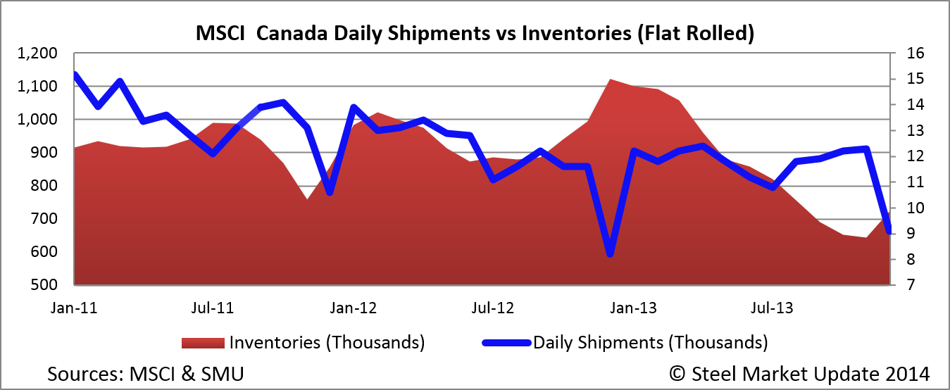 Canadian service center shipments for all steel products were reported at 348,700 net tons (NT) in December, down 26.3 percent over November figures but up 3.0 percent from December 2012 shipments. With 20 shipping days in December, daily shipments are calculated to have been 17,400 tons per day, down from 23,700 tons per day the previous month. Inventory grew in December to 1,364,900 NT, up 8.6 percent from the previous month but down 25.5 percent from December 2012 tonnage. Total steel receipts fell month-over-month to 456,900 NT, with an average daily receipt rate of 22,845 NT, down from 24,200 NT the previous month.