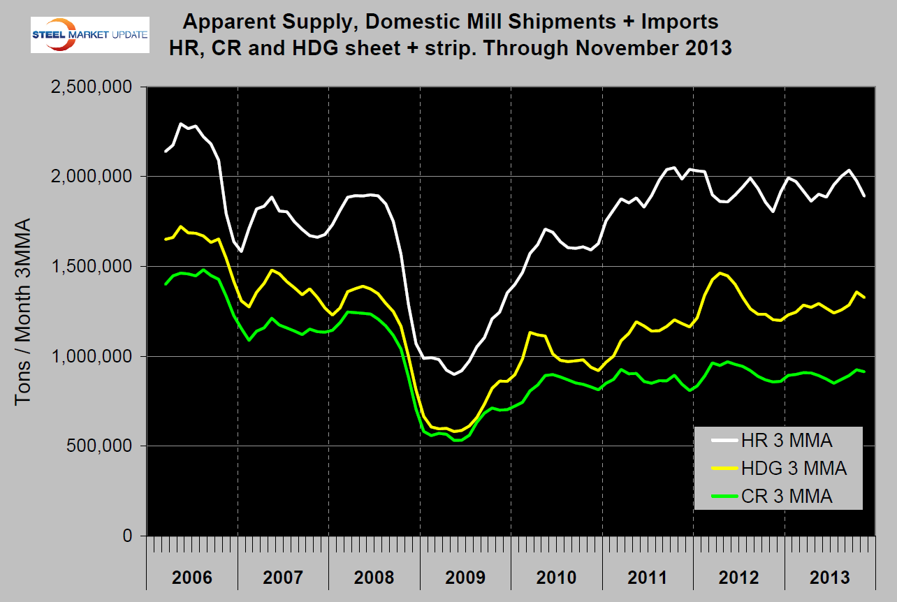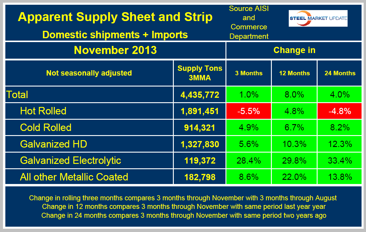 Apparent supply is defined as domestic mill shipments to domestic locations plus imports. Sources are the American Iron and Steel Institute and the Department of Commerce. The three month moving average of the total tonnage of sheet and strip supply was 4,436,772 tons per month in the period September through November. This was up by 1.0 percent from the June through August period and by 8.0 percent from September through November 2012.