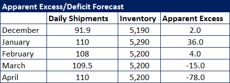 For Premium Level members, Steel Market Update is producing forecasts based on our estimates as to where we believe shipments and inventories will end up at the end of the next four months. We are then able to project our Apparent Excess/Deficit based on those numbers using our formula. Here is what we think the next four months will look like: