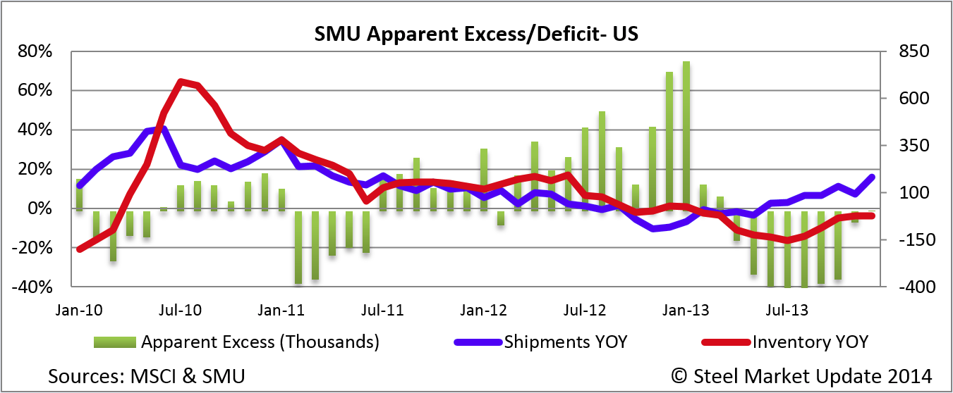Our Apparent Excess/Deficit analysis of the December distributor data resulted in service center inventories being balanced at +2,000 tons. This was due to an increase in flat rolled inventories of 337,300 tons over the prior month. Inventories are also very close to the 5,181,000 tons reported by the MSCI at the end of December 2012. Shipments increased in December year-over-year and were very close to the November 2013 levels.