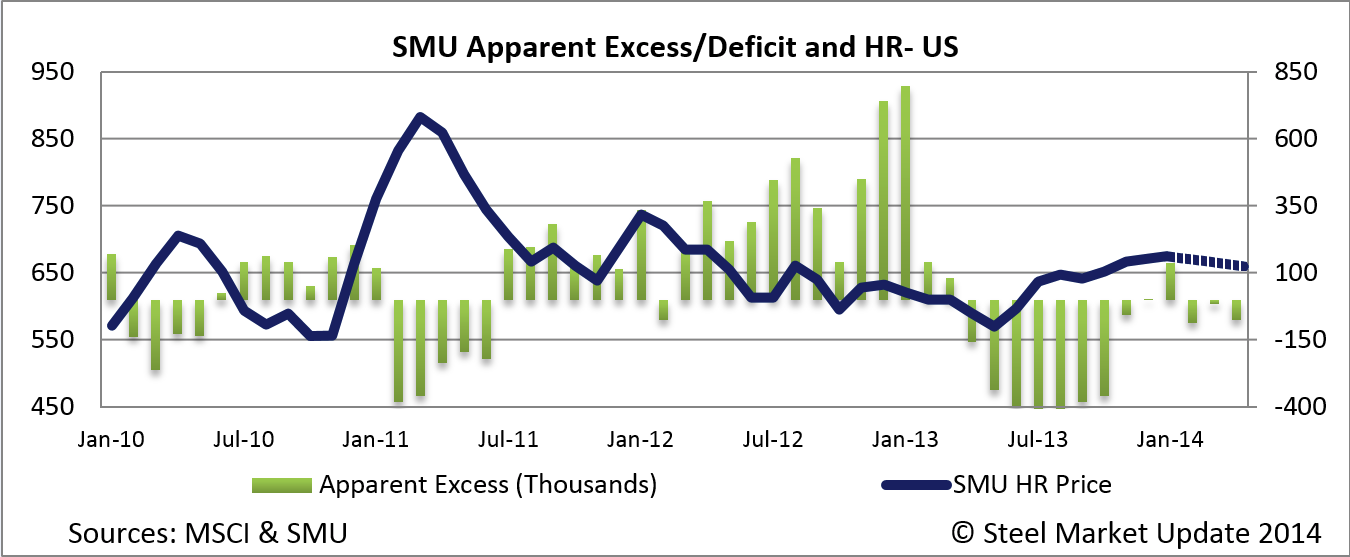 The Metal Service Center Institute (MSCI) produced their analysis of service center shipments and inventories as of the end of December 2013. According to the MSCI flat rolled inventories stood at 4,981,400 tons which represented a 2.6 month’s supply on a non-seasonally adjusted basis and 2.1 months supply based on seasonally adjusted data. Steel Market Update (SMU) produces an analysis of the service center data for our Premium Level members. The resulting Service Center Apparent Excess/Deficit analysis and forecast is a leading indicator as to new mill order patterns from the service center group which are critical to lead times and thus the ability of the domestic mills to keep prices from falling.