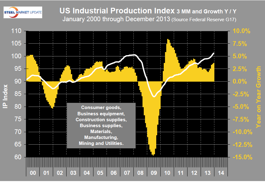 Industrial production and manufacturing capacity utilization, December 2013. Both these data points are reported in the Federal Reserve G17 data base. The IP index was reported as 101.76 for December; this was the first month for the index to exceed the pre-recession peak of September 2007. The three month moving average (3MMA) at 101.21 was the highest since January 2008 which was also the pre-recessionary peak. This index is based on the July 2007 level being defined as 100. The 3MMA of the year over year growth rate has accelerated for five straight months and in December stood at 3.6 percent.