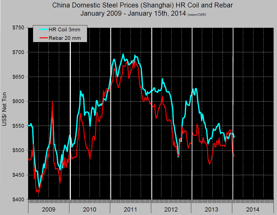 Chinese domestic prices have been declining since Q3 2011 with a few blips along the way (Figure 2). The price of hot rolled coil has declined from $696 / ton on May 4th 2011 to $527 on January 15th 2014, a decline of 24.3 percent. Prices are per short ton delivered Shanghai and include VAT. Rebar has experienced a sharp decline in the last few weeks and is down by 28.6 percent since August 17th 2011. (Sources: China Metals Weekly, Moody’s Economy.com and Goldman Sachs)