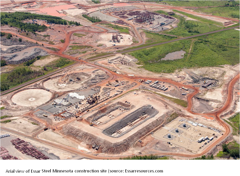Essar Steel Minnesota is a state-of-the-art open pit mining, concentrating and pelletizing plant under construction on the western end of the Biwabik Iron Formation in the Mesabi Range. Construction began in 2010 and upon completion ESML expects to have an annual capacity of 7 million tons of pellets per year.