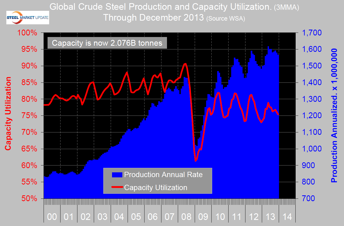 Global steel production in December was 129.2 million tonnes, an increase of 0.8 percent from November and of 6.3 percent from December 2102 according to the World Steel Association. The decline in the 2nd half of 2013 was much less than occurred in the previous three years. Capacity utilization in December was 74.7 percent. The annualized three month moving average of production was 1.566 billion tonnes in December (Figure 1).