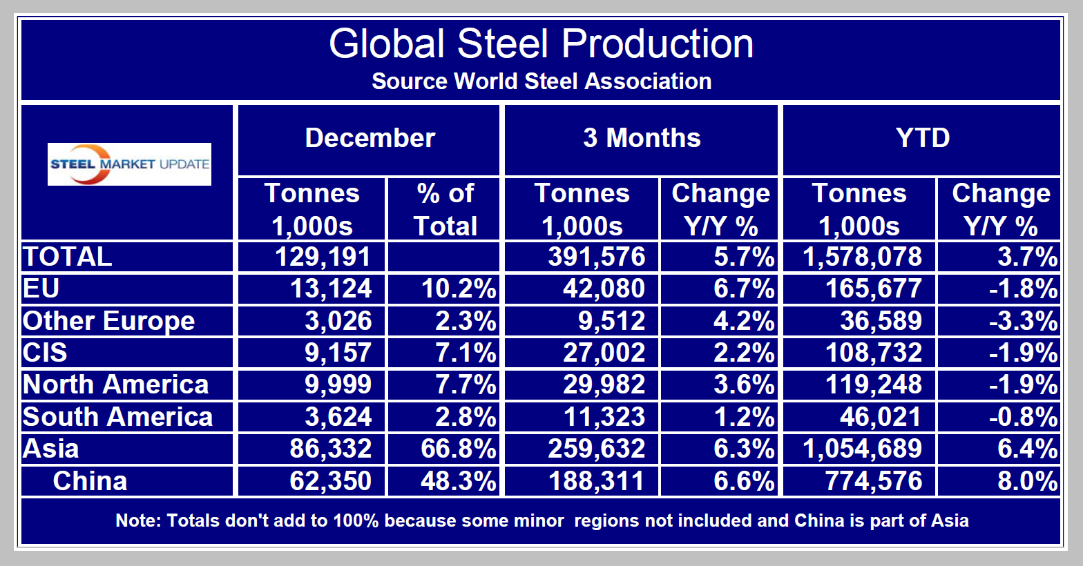 SMU Comment: Recent global steel production results are very encouraging especially in the face of recent commentary about a global economic slowdown. The data from the World Steel Association shows North America to have the strongest momentum of all regions and to have had a 7.7 percent y/y growth rate in the 4th quarter. This result is in accordance with the service center shipment report that was issued by the MSCI last week. (Source World Steel Association)