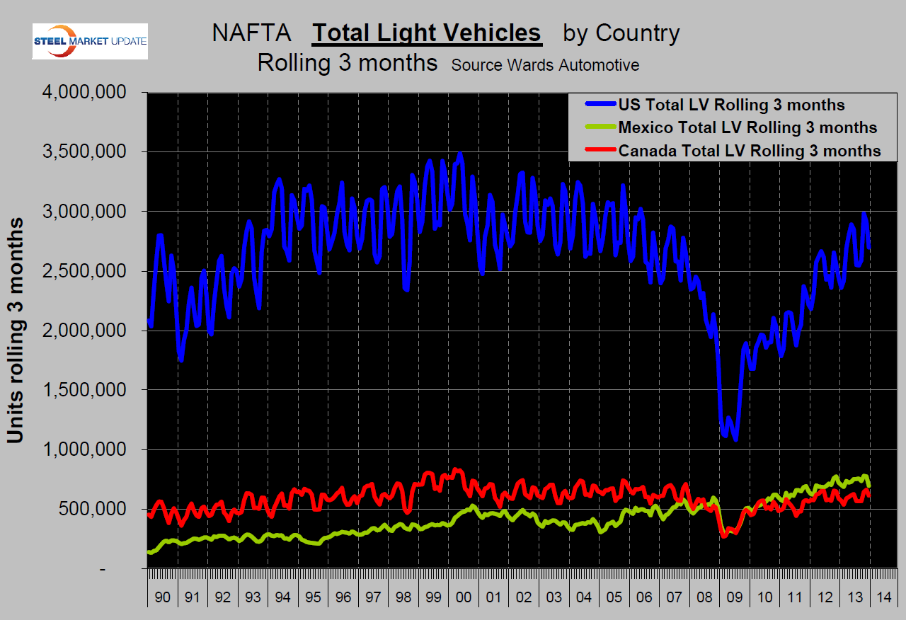 Light vehicle production in NAFTA in 2013 totaled, 16,141,347 units, the best year since 2002 and an increase of 6.0 percent on 2012 (Source Wards Automotive.). In 3 months through December production was up by 6.9 percent year over year. Light trucks which include crossovers are surging faster than cars, the year over year growth rates were 11.8 percent and 1.0 percent respectively.
