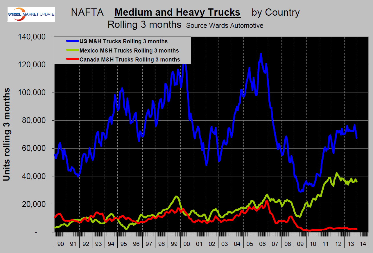 Total production in 2013 breaks down to 7,133,422 and 9,007,925 for cars and light trucks respectively. In three months through December, growth rates of total light vehicles year over year were, US 7.0 percent, Canada 4.4 percent Mexico negative 3.5 percent. The US continues to be the success story of NAFTA auto production (Figure 1), though it must be said that the US had the more ground to make up from the recession. More good news for US light vehicle production, according to AMM, is that through August capital expenditure announcements were US $3.902 billion, Mexico $1.020 billion and Canada $0.250 billion. The growth of medium and heavy truck production has stalled overall and had negative growth of 3.8 percent in NAFTA as a whole in Q4 (Figure 2).