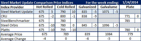 For the first time in what seems like forever, the four indexes followed by Steel Market Update, as well as our own, have benchmark hot rolled coil at the same average during the same week. Hot rolled coil was reported by all indexes this past week at $675 per ton ($33.75/cwt). The similarities stopped there, however, as cold rolled, galvanized, Galvalume and plate had spreads between the various indexes of at least $10 per ton or more.