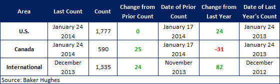 According to Baker Hughes data from January 24th, 2014, the U.S rig count for this week is 1,777 rigs exploring for or developing oil or natural gas. This count is unchanged when compared to last week, with oil rigs up 8 to 1,416 rigs, gas rigs down 9 to 356 rigs, and miscellaneous rigs up 1 to 5 rigs. Compared to last year the 1,777 count is an increase of 24 rigs, with oil rigs up by 101, gas rigs down by 78, and miscellaneous rigs up by 1.