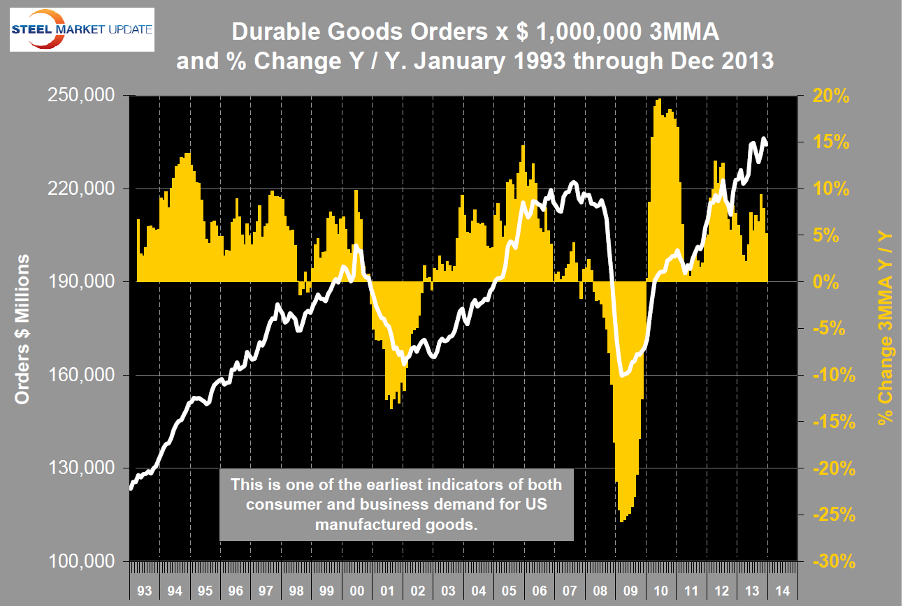 SMU comment; Durable goods orders are one of the earliest indicators of both consumer and business demand for US manufactured goods. The trend line is still on track to reach B$250 / month by the end of this year. The positive trajectory of Durable Goods orders confirms other manufacturing trends that we track, its erratic nature is driven in large part by the fluctuation in orders for civil aircraft.