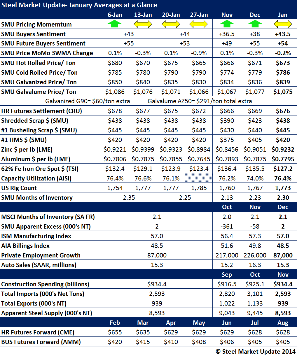 During the month of January Steel Market Update (SMU) adjusted our Price Momentum Indicator from Higher to Neutral. Benchmark hot rolled prices averaged $673 per ton ($33.65/cwt) according to the Steel Market Update index. CRU posted their monthly average at $676 per ton ($33.80/cwt).