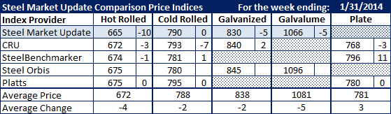 Steel Market Update follows a number of indexes and their average price points on hot rolled, cold rolled, galvanized, Galvalume as well as plate.