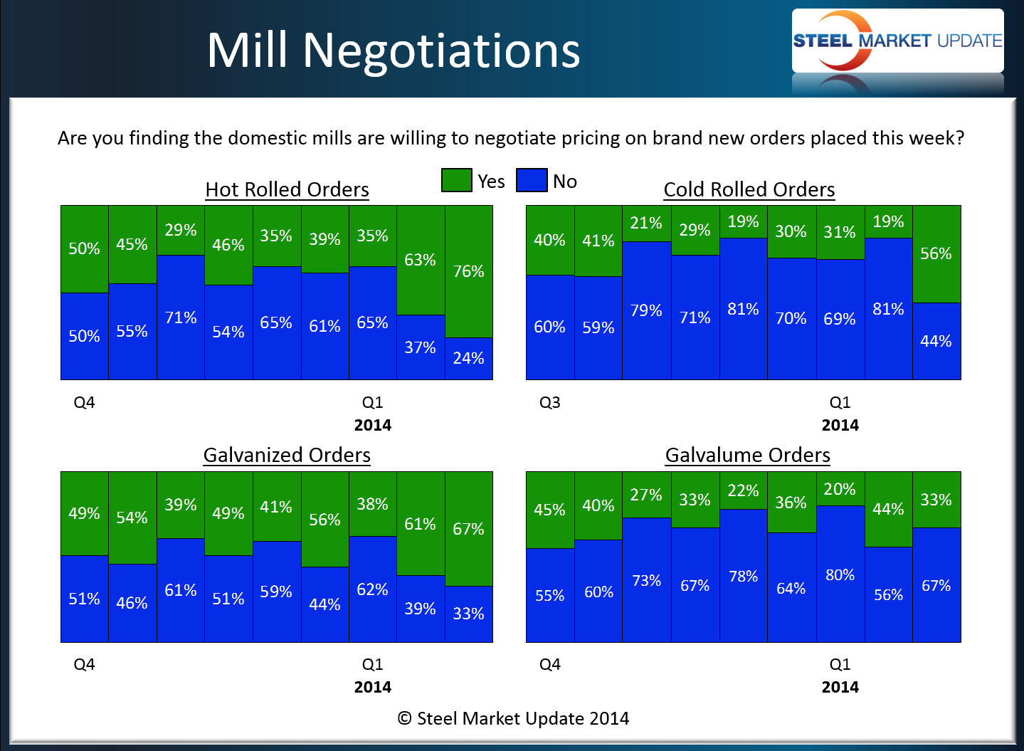 Our respondents reported three of the four flat rolled products we are currently following, the percentage of the respondents reporting the domestic mills as willing to negotiate pricing on hot rolled, cold rolled and Galvanized increased compared to two weeks ago. The only item which showed less willingness to negotiate was Galvalume which dropped from 44 percent to 33 percent.