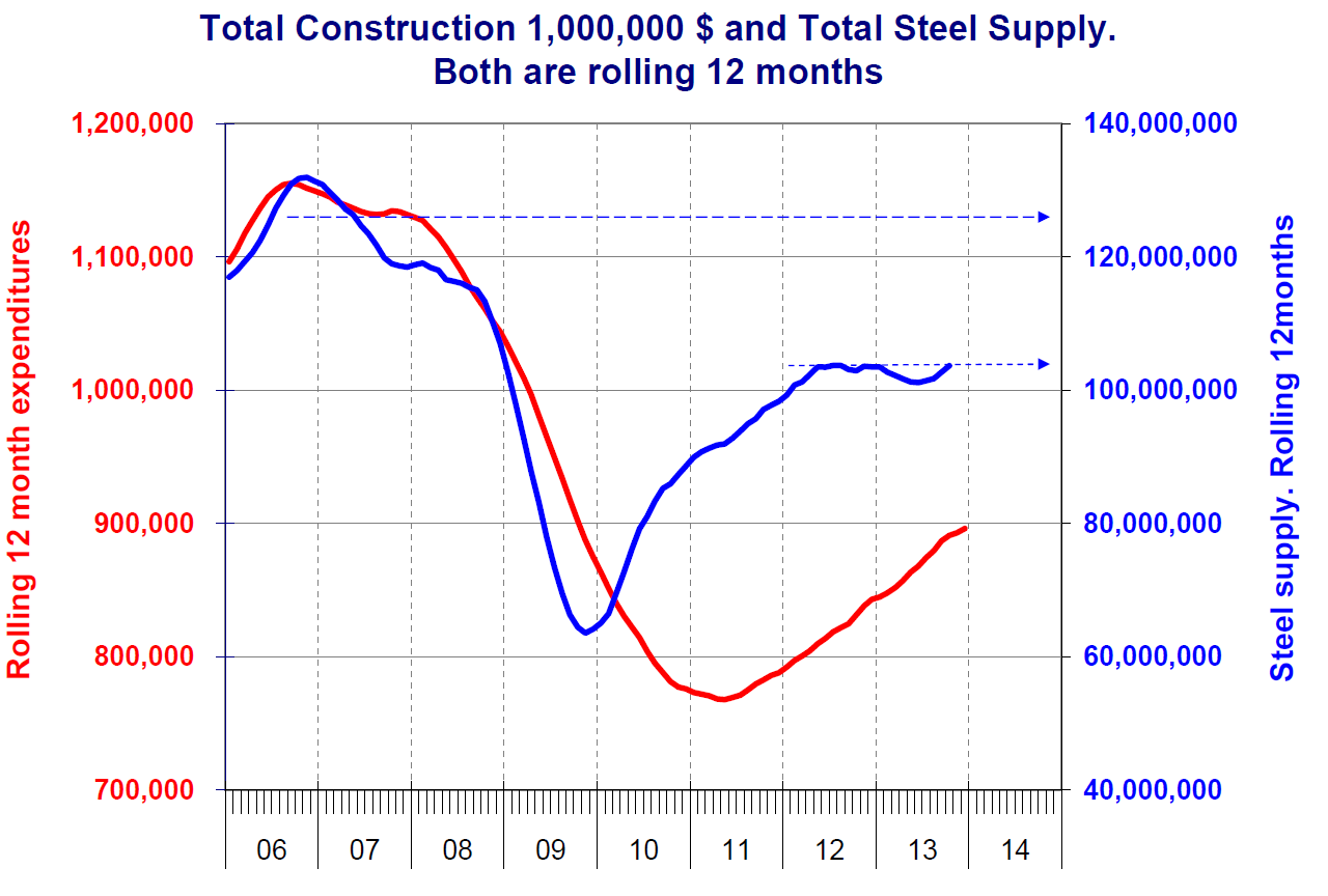 Figure 1 shows the relationship between total steel supply (domestic + imports) and total construction expenditures. It suggests that the upside potential for steel demand is about 20 million tons per year as construction recovers to its pre-recessionary peak. At the current rate of growth this will not occur until the end of 2017. (Source: US Commerce Department)