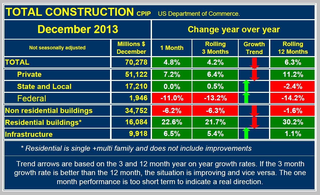 Total construction expenditures in December were $70.278 billion, up by 4.8 percent from December 2012. Fourth quarter expenditures were up by 4.2 percent year over year (y/y) and 2013, as a whole, was up by 6.3 percent from 2012. Private construction continues to be the driver, up by 6.4 percent in Q4 y/y but state and locally financed work also achieved a small gain of 0.5 percent. Federally financed construction is not much of a factor in the big picture and it continues to decline sharply, down 13.3 percent in Q4 y/y (Table 1). Residential building construction is still growing rapidly although the pace is slowing. Non residential buildings have slipped back into contraction as measured both quarterly and annually y/y. Infrastructure expenditures expanded by 5.4 percent in Q4 y/y.
