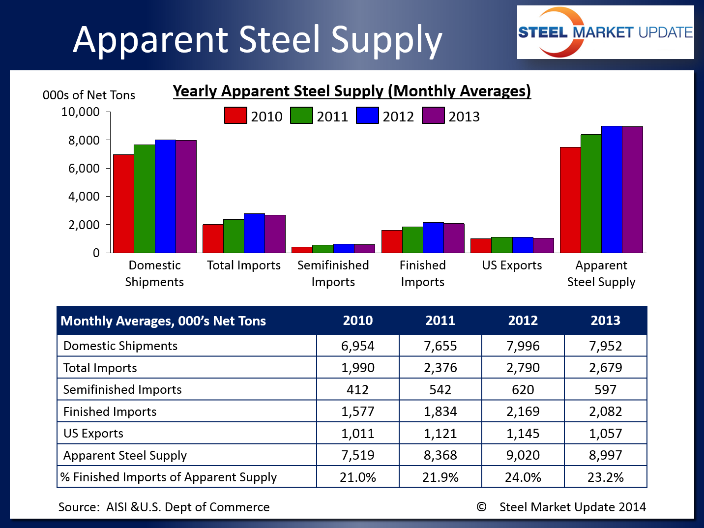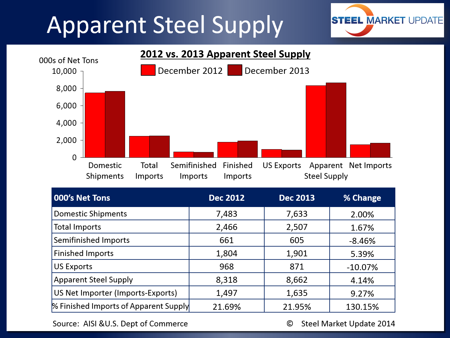Apparent steel supply for December was 8,662,212 net tons (NT), a 4.14 percent increase compared to the same month one year ago. This was due to a slight increase in domestic shipments and a decrease in exports. The net trade balance from the difference between imports and exports was a surplus of 1,635,411 net tons in December, an increase of 9.27 percent from one year prior. The graphic below gives a full comparison of December 2012 and 2013 figures.